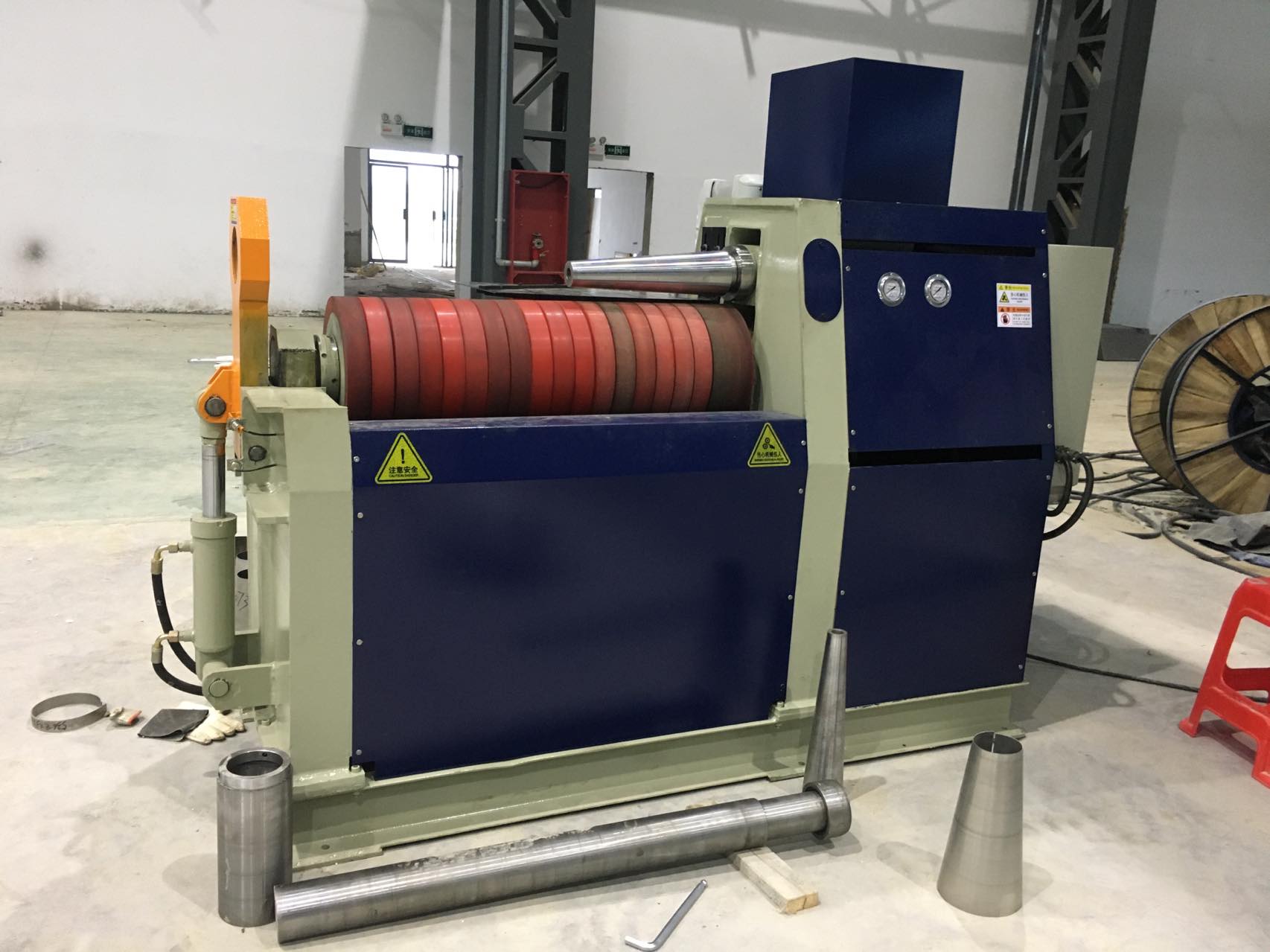 二辊Leyu Sports为我公司生产的技术产品。其一辊为钢辊,另一辊为钢辊芯外包弹性层,板材置于两辊间并调整其间距,使其接触——加压——胶辊变形,板材随之局部变形,驱动两辊旋转,使板材连续弯卷成型。板料一次卷制即可加工成型,无明显直边,卷圆精度高。是高效、高精度、高度自动化的卷板加工设备。
